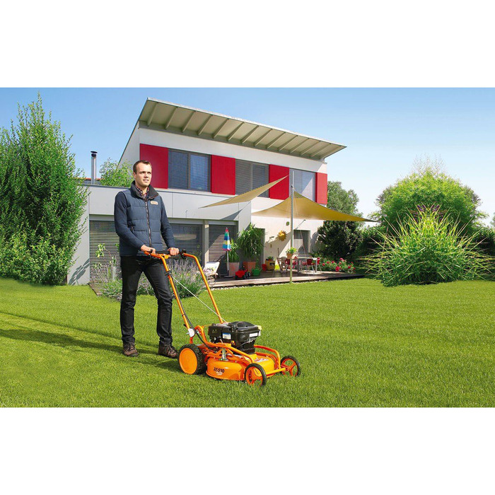 Der Mulchmäher AS 510 ProClip 4T A ist mit dem professionellen Briggs & Stratton 850E I/C Motor mit einer maximalen Motorenleistung von 5,7 PS ausgestattet. Der Motor ist um 180 Grad gedreht montiert. Durch die dadurch geschaffene ausgewogene Gewichtsverteilung werden hervorragende Handlingeigenschaften erreicht. Mit einer Schnittbreite von 51 cm erzielt der AS 510 ProClip 4T A Flächenleistungen von bis zu 2.100m² pro Stunde. Optimalen Motorschutz beim Treffen auf Fremdkörper bietet die dritte Kurbelwellenlagerung in Verbindung mit einer Rutschkupplung am Messer. Große profilierte Antriebsräder sorgen für optimalen Vortrieb auch am Hang. Per Variomatic lässt sich die Geschwindigkeit von 2,1 – 4,0 km/h komfortabel, stufenlos und während der Fahrt einstellen. Durch ihre spezielle Form drücken die doppelt kugelgelagerten Vorderräder kaum Gras um. Das Gras richtet sich nach dem Darüberfahren schnell wieder auf, sodass es auf voller breite sauber gemäht wird. Das geschnittene Gras wird in einem Arbeitsgang verwirbelt, mehrfach zerkleinert und fällt gleichmäßig in die Grasnarbe zurück. Sie verlieren keine Zeit durch Anhalten und Entleeren eines Fangkorbes und ersparen sich aufwendiges Entsorgen des Schnittgutes. Die Optik des Schnittbildes des AS 510 ProClip 4T A ist vergleichbar mit dem von Fangsack-Mähern.