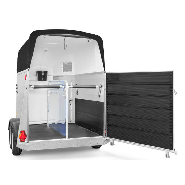 Die Leichtgewichte unter den Einsteigermodellen: zwischen 773 und 887 Kilo bringen die EQUITOS Alu Modelle auf die Waage. Und das bei umfangreicher Serienausstattung wie die Humbaur EquiSpace® Ausstattung, die viel Bewegungsraum fürs Pferd verspricht. Zur Serienausstattung des EQUITOS Alu Plus gehört eine abschließbare Sattelkammer mit Sattelhalter, Trensenhalter, Spiegel und Netz.