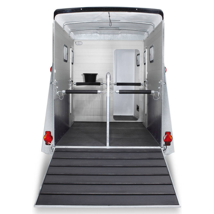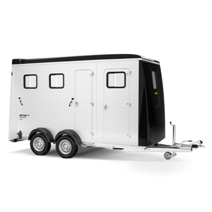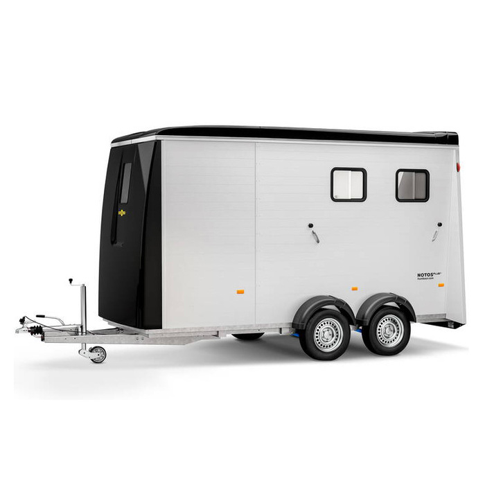 Der Notos® PLUS ist die Humbaur Business-Class für Ihren Pferdetransport. Er nimmt zwei Pferde komfortabel mit auf die Reise. Darüber hinaus bietet seine grosszügige Kabine im Bug (nach Wunsch ausbaubar) mit viel Platz für Sättel, Material und die Belange der Reiter. Die Heckklappe rüsten wir mit einer Gummimatte mit Trittleisten aus. Serienmässig ausgestattet mit AluBiComp Boden. Die Seitenwände sind aus robusten Aluprofilen und werden durch das Dach und den Bug aus Vollpoly ergänzt. Ein Großraumanhänger der keine Wünsche offen lässt.