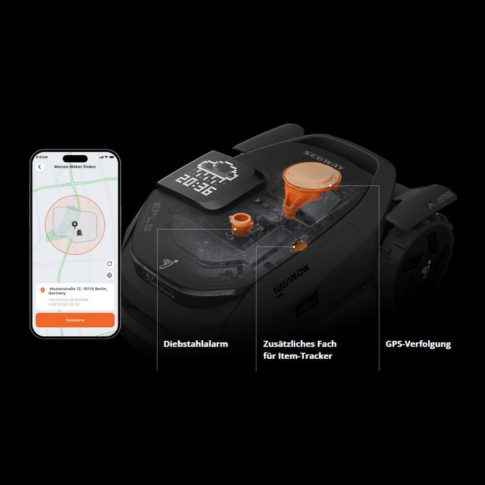 Dank erweiterter Diebstahlalarme und GPS-Tracking können Sie den Standort Ihres Rasenmäher-Roboters mithilfe der Navimow App ganz einfach ermitteln. Ein zusätzliches Fach ermöglicht die Lagerung eines Item-Trackers.